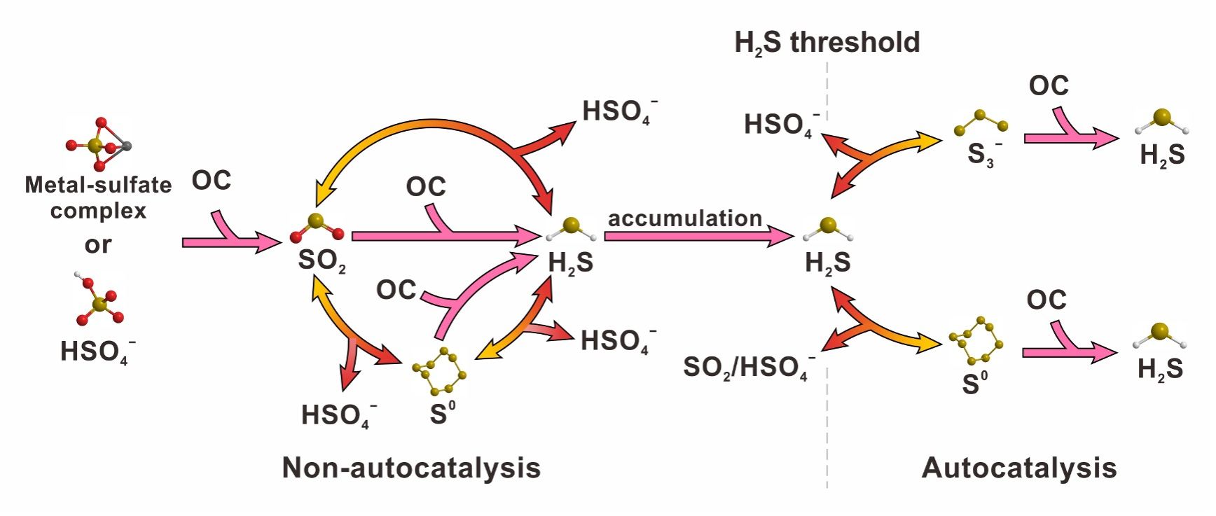Their results indicate that sulfate is transformed to H2S through a series of reduction and disproportionation reactions. For example, in the Na2SO4-H2SO4-CH4-N2-H2O system (Fig. 1, where N2 is used as an internal reference), sulfate is first reduced by methane to form SO2. Then, SO2 is further disproportionated or reduced to form H2S. The interaction between high valence sulfur species and H2S leads to the formation of intermediate valence sulfur species (i.e., S3- and S0), which directly oxidize methane to form H2S and CO2. This study provides direct evidence that both S3- and S0 can oxidize hydrocarbon, contributing to the autocatalytic effect observed in the TSR reaction. The transformation of sulfur species during TSR reaction is illustrated in Fig. 2.