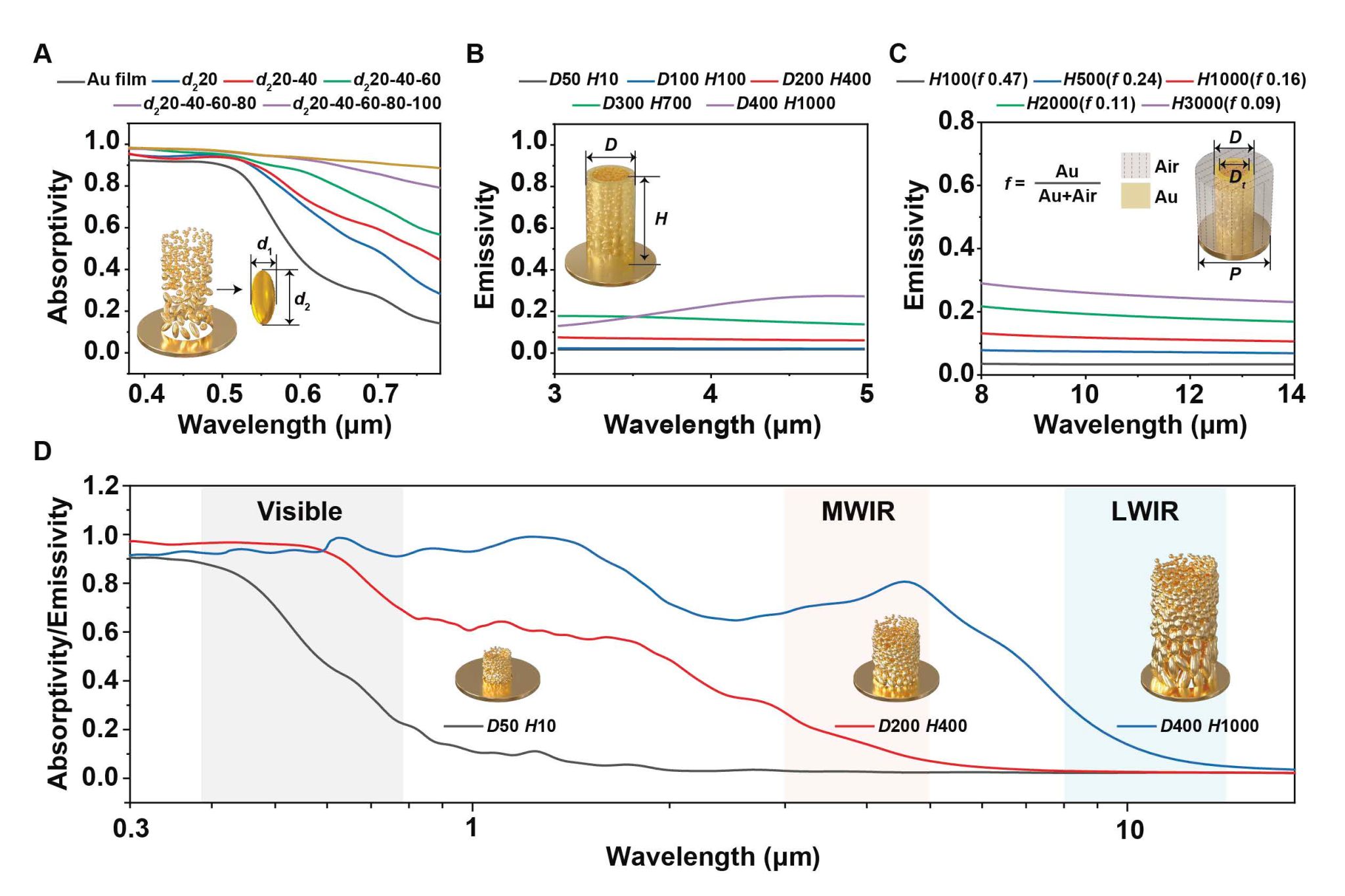 Fig. 2. Simulated absorptivity/emissivity spectra of the NPAHP-based skin-like metamaterial with different structural designs. (A) Dependence of the absorptivity/emissivity on the Au NPs size distribution in the visible band. (B) Dependence of the absorptivity/emissivity on the D and H of Au hollow pillars in the MWIR band. (C) Dependence of the absorptivity/emissivity on the Au ratio (f) in the LWIR band. (D) Full-wave electromagnetic simulation for three representative structure models over 0.3-18 μm.