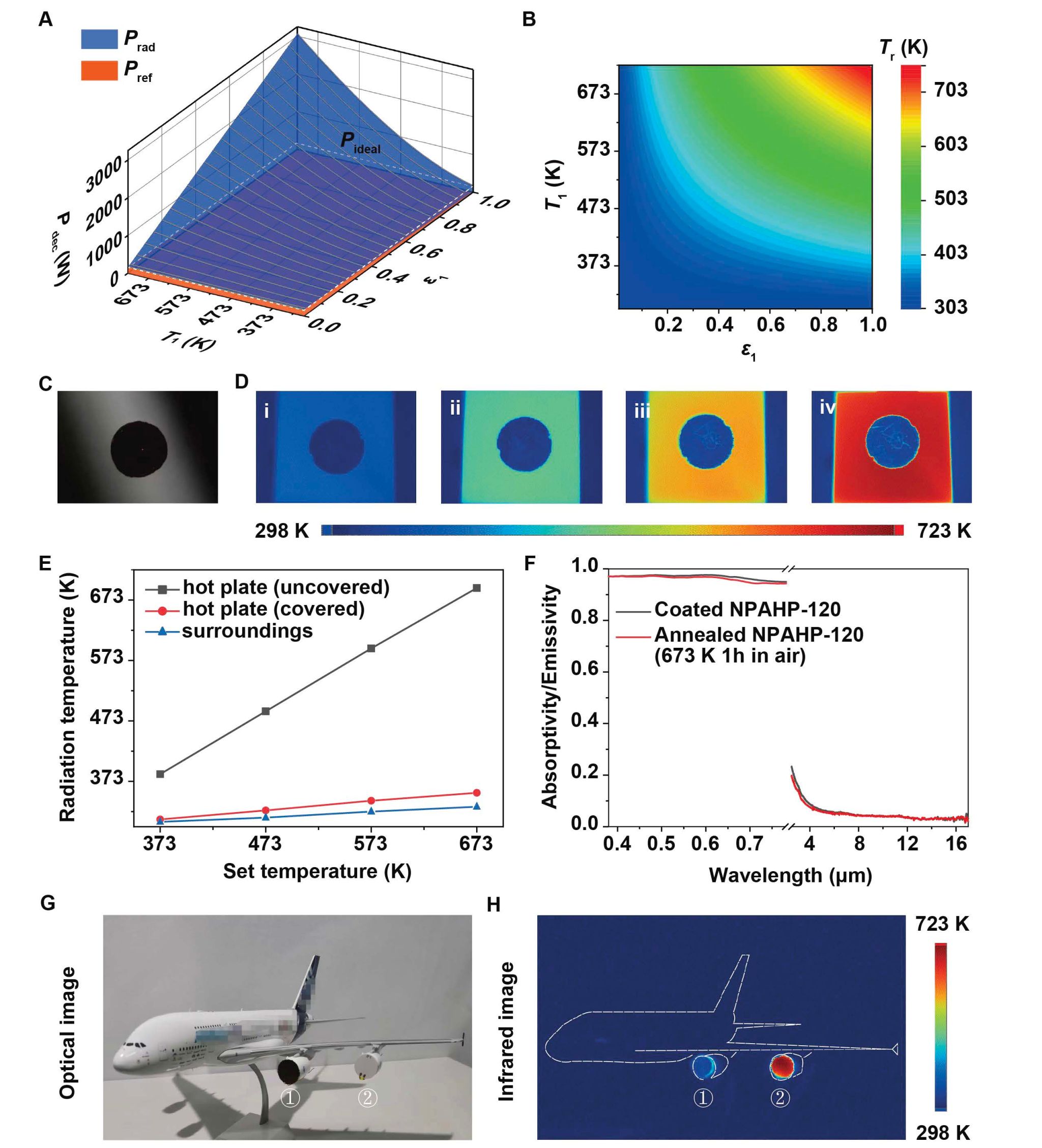 Fig. 5. Demonstration of high-temperature camouflage performance of the NPAHP-120-based skin-like metamaterial. (A and B) Dependence of Pdet (A), and Tr (B) on T1 and ε1. (C) Optical photograph of the NPAHP-120-based camouflage film. (D) Infrared photographs of the hot plate covered with NPAHP-120-based camouflage film at different set temperatures (373, 473, 573, 673 K). (E) Detected radiation temperature of the hot plate (covered and uncovered with NPAHP-120-based film), and surroundings at different temperatures. (F) The unchanged experimental absorption spectra of the NPAHP-120-based camouflage film after air annealing at 673 K for 1 h, which suggests its good stability at high temperature. (G and H) Optical (G) and infrared photograph (H) of the aircraft engine models covered (①) and uncovered (②) with NPAHP-120-based camouflage film.