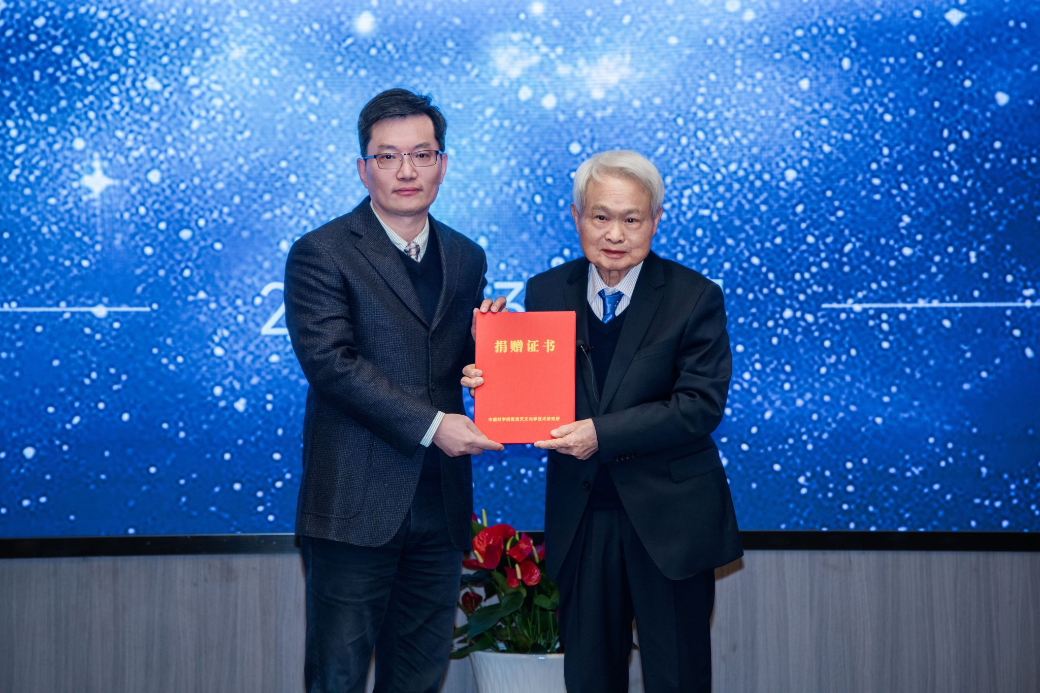 Gong Xuefei, Director of the Nanjing Institute of Astronomical Optics & Technology (NIAOT) presented the certificate of donation to Su Dingqiang