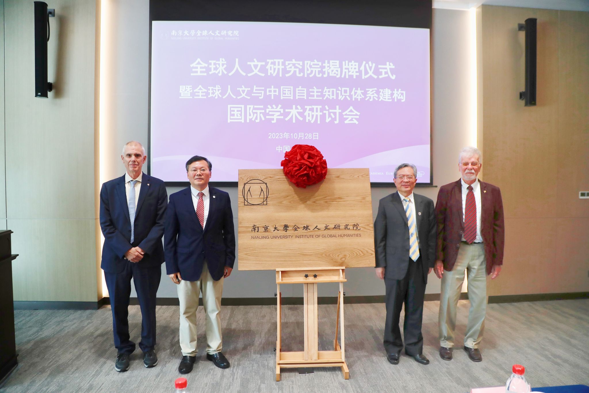 Secretary Yang Zhong, Dean He Chengzhou, Hans van de Ven, Pro-Vice-Chancellor of Cambridge University, and Svend Eric Larsen, former Vice President of Academy of Europe unveiled the plaque for the Institute of Global Humanities of Nanjing University. The inauguration ceremony was presided over by Shi Hongmei, Secretary of the Party Committee of the School of Arts of Nanjing University.