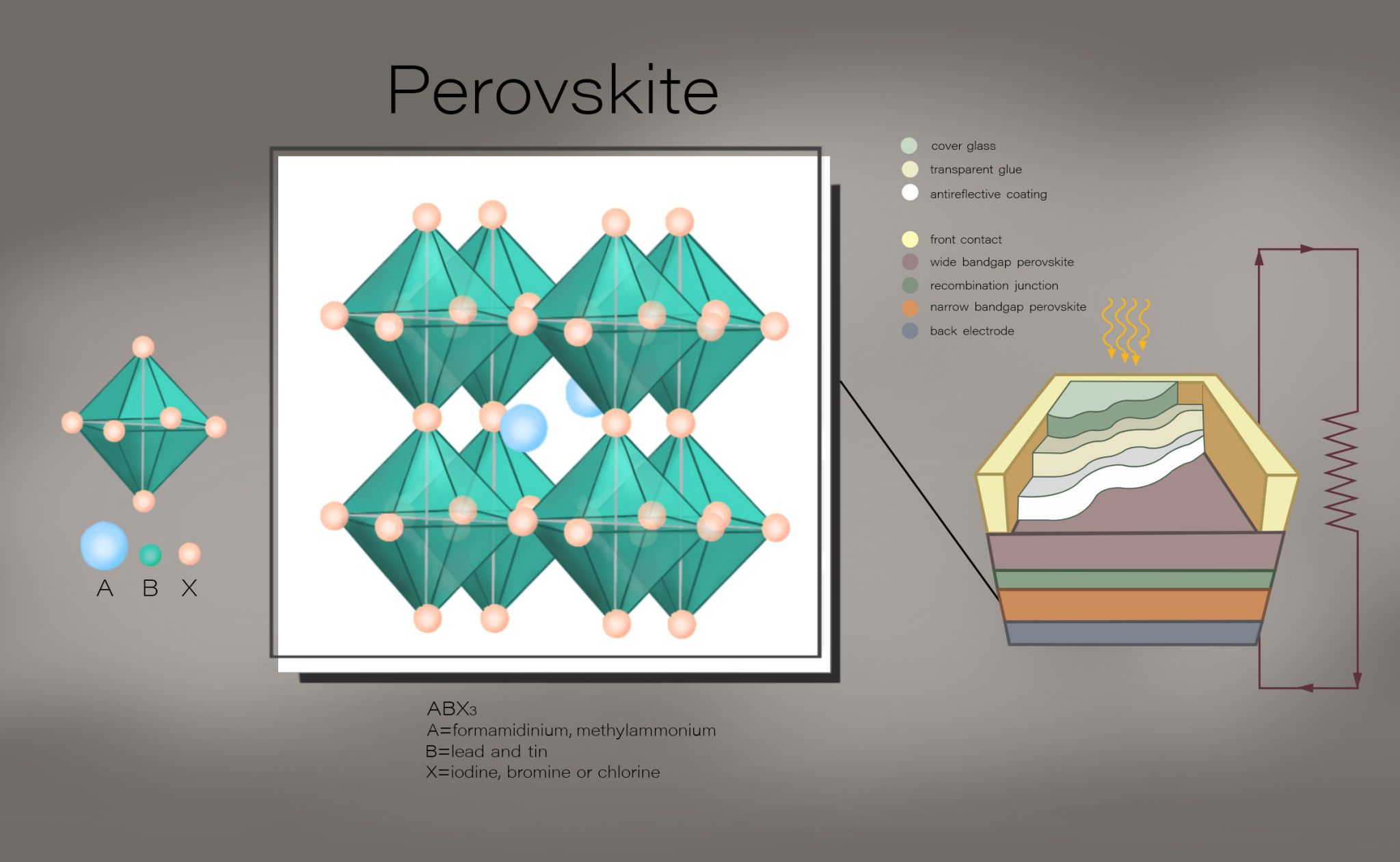 In a single junction solar cell, the extra energy in high frequency wavelengths of sunlight is wasted as heat. In an all-perovskite tandem solar cell architecture, a layer called a wide-bandgap perovskite (WBP) — specifically tuned to capture high frequency light — is combined with a narrow-bandgap perovskite (NBP) tuned to low frequency light.