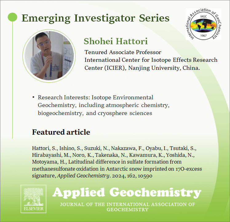 In Feb 2024, Shohei Hattori at International Center for Isotope Effects Research (ICIER), School of Earth Science and Engineeringgineering and Engineering, NJU was awarded "Emerging Investigator Award" by International Association of GeoChemistry (IAGC). His original research paper, titled “Latitudinal Difference in Sulfate Formation from Methanosulfonate Oxidation in Antarctic Snow Imprinted on 17O-excess Signature,” is featured in the Emerging Investigator Award, and has been selected as the Editor’s Choice of IAGC journal Applied Geochemistry.