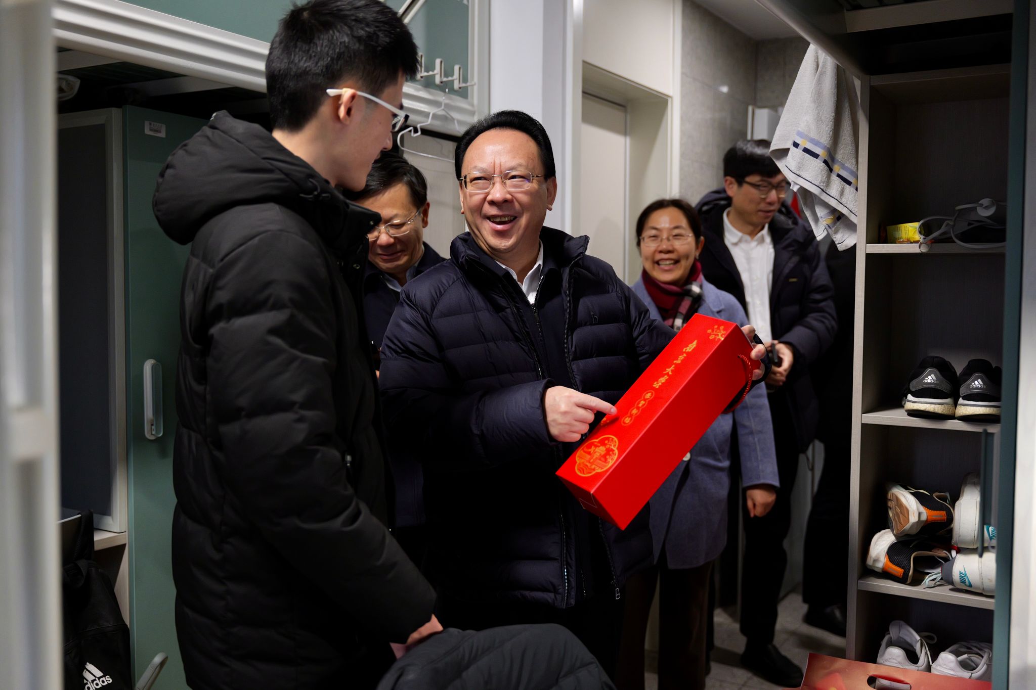 On January 26, as the Chinese New Year is approaching, Tan Tieniu, Chair of NJU CPC Council and Academician of the Chinese Academy of Sciences visited teachers, students and staff staying on campus and sends his warmest regards to them. Tan firstly visited dormitories and exchanged with students. While sending them New Year gift packages, he said to them that NJU is students' family, hence the university will make careful arrangements and make sure every student can enjoy the Spring Festival just like at home.