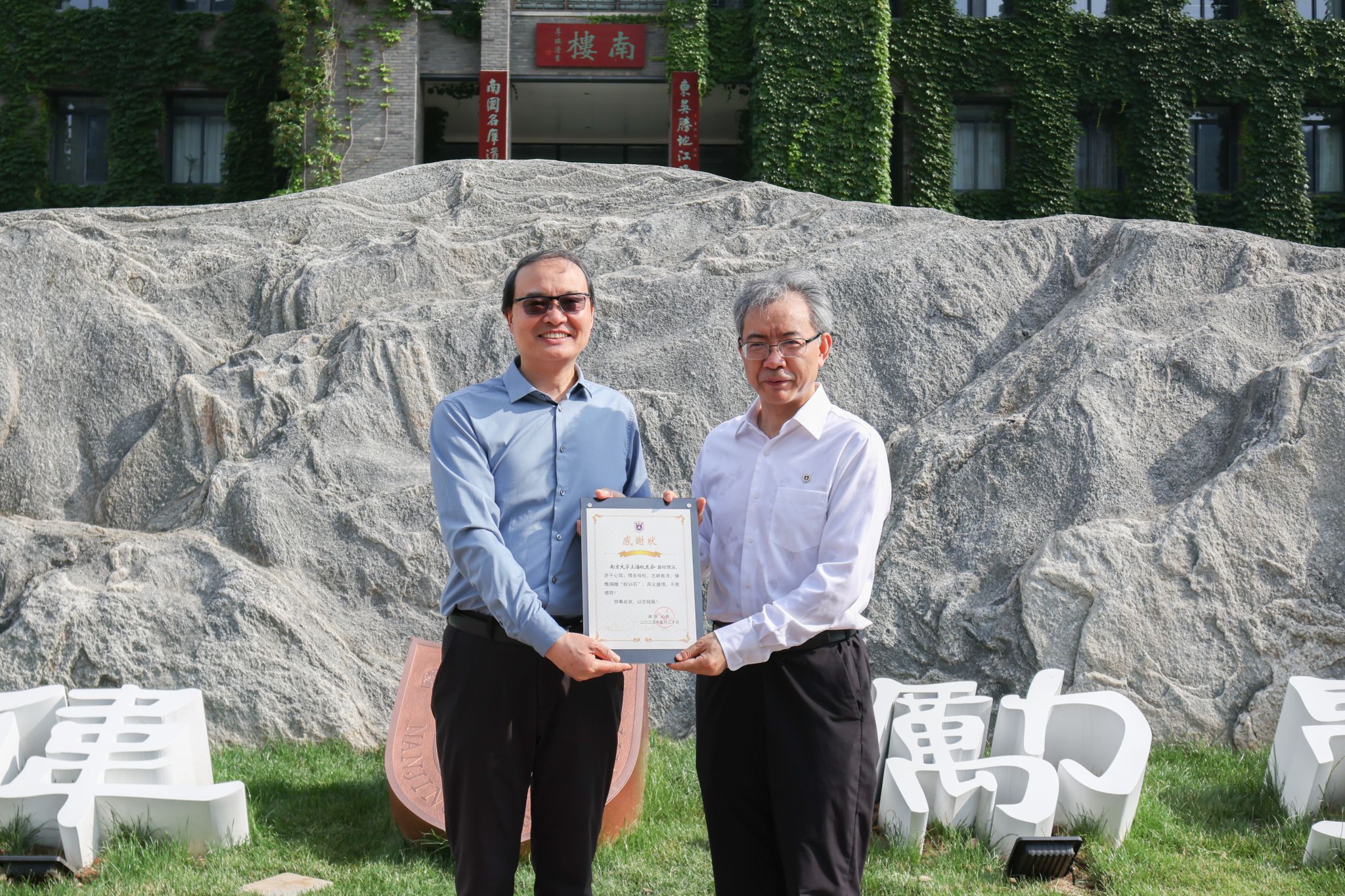 On May 20th, the motto stone donated by Nanjing University Shanghai Alumni Association was officially unveiled. During the ceremony, Tan Zhemin, President of Nanjing University and Academician of the Chinese Academy of Sciences presented a certificate of appreciation to Zhu Zhendong, President of the Shanghai Alumni Association.