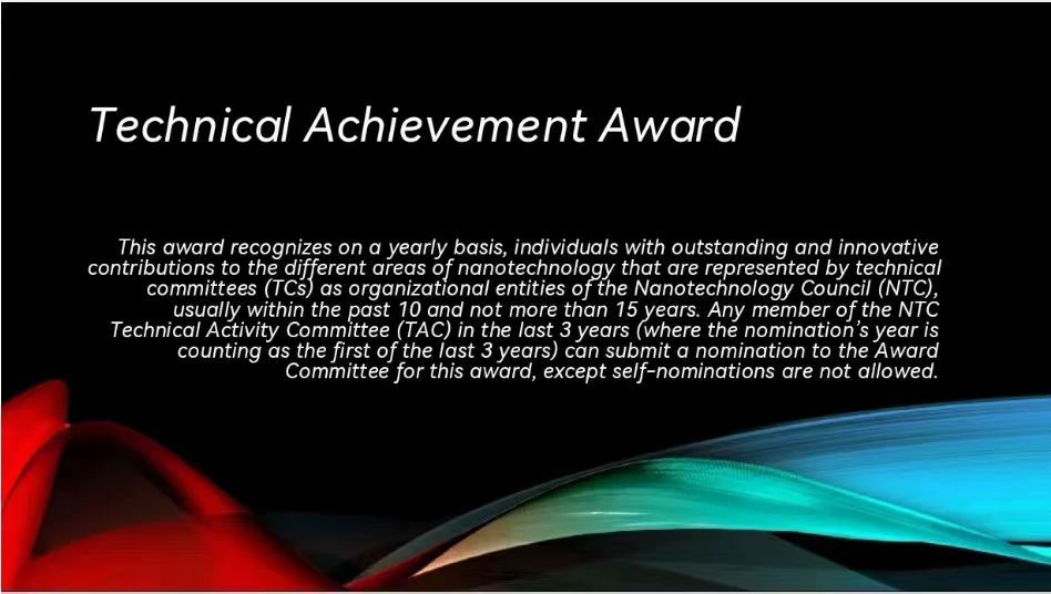 The IEEE NTC (the Institute of Electrical and Electronics Engineers Nanotechnology Council) Technical Achievement Award was established in 2022 to recognize individuals with outstanding and innovative contributions to in the field of nanotechnology. The selection criteria include the quality of their achievements, impact on the relevant field and community, and service on the Nanotechnology Council.