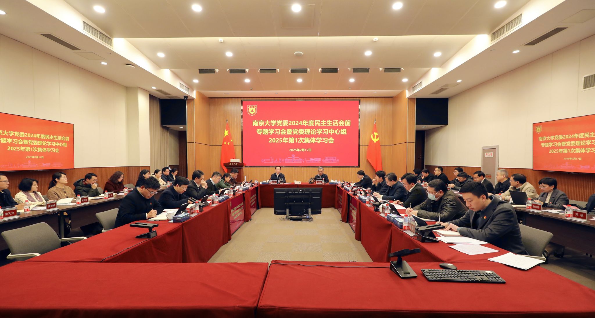 根据中央关于开好2024年度党员领导干部民主生活会的部署要求,2月17日下午,我校召开2024年度民主生活会前专题学习会暨党委理论学习中心组2025年第1次集体学习会议,以集中学习、交流研讨的方式深入学习贯彻习近平新时代中国特色社会主义思想和党的二十届三中全会精神,学习领会习近平总书记关于党的建设的重要思想、关于党的自我革命的重要思想以及关于全面加强党的纪律建设的重要论述、关于全面深化改革的一系列新思想新观点新论断,一体学习习近平总书记在全国教育大会上的重要讲话精神,重点学习习近平总书记在中央政治局民主生活会上的重要讲话精神,进一步统一思想、深化认识,为高质量高标准开好民主生活会打牢思想基础。校党委书记、中国科学院院士谭铁牛主持会议并作领学发言及总结讲话。校长、中国科学院院士谈哲敏出席会议并作领学发言。