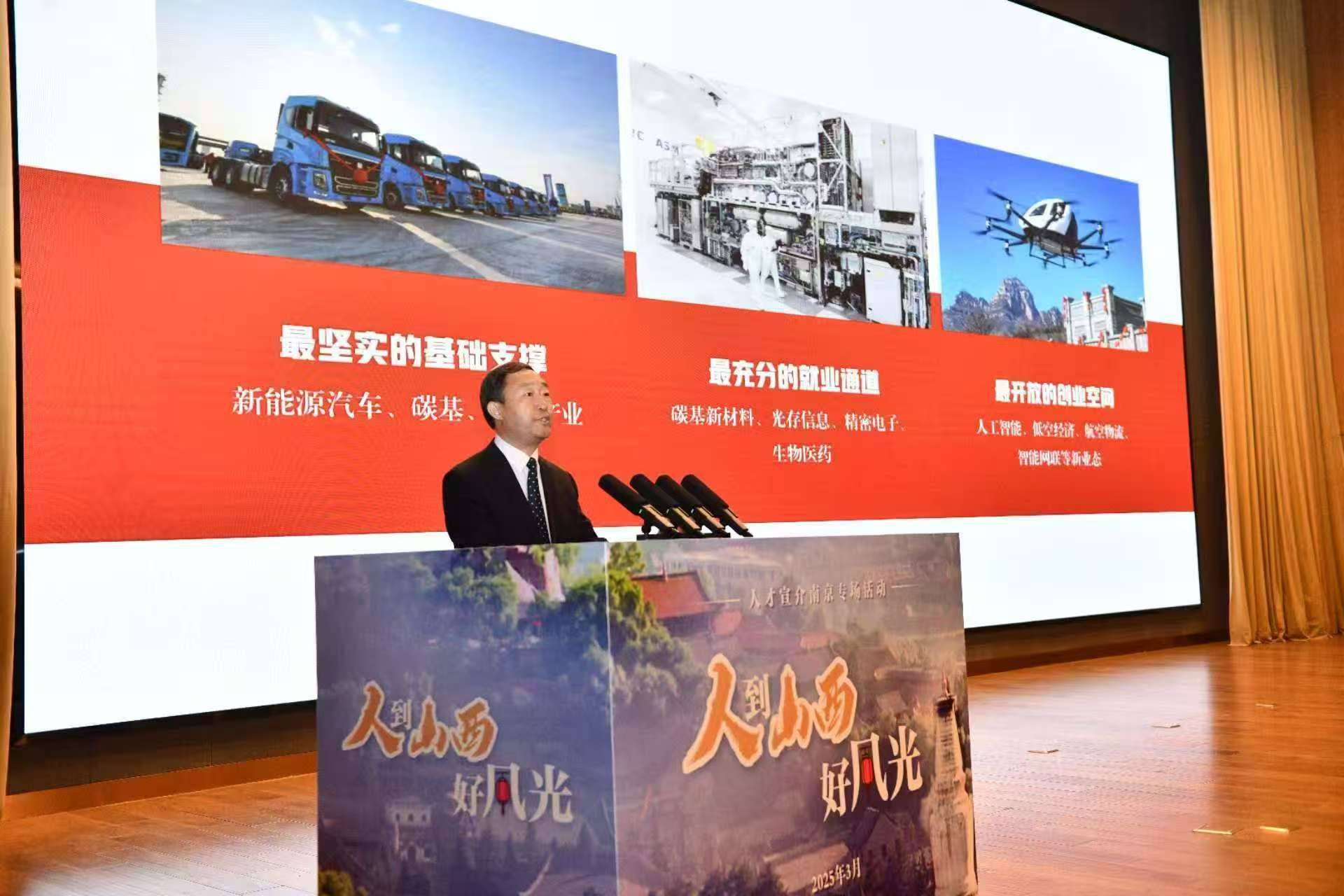 山西省委组织部部务委员、人才办主任于鹏飞向到场学生介绍山西省的综合发展情况和人才引进相关政策。他介绍,当前山西省深入实施人才强省战略,制定“1+N”人才政策体系,推动构建“引—育—留—用—服”的人才生态闭环。
