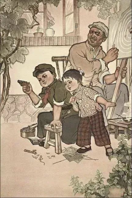 刚到创作班时,高云的绘画水平并不出众,因为在此之前,他还未画过一幅严格意义上完整的美术作品。但他深知勤能补拙,凭借异常勤奋的练习,不久就画出了平生第一张完整的绘画作品——《小小神枪手》。这幅作品画了一位老人、两个小孩和几支枪,画面中爷爷打的是真靶子,男孩拿着小木枪做打靶状,女孩背着一支玩具枪,三个人物表情生动,英气勃发。这是对生活的概括和提炼,是那个全民皆兵时代的典型缩影,“解放军光荣”的思想深入人心,女孩子“不爱红装爱武装”的形象跃然纸上。