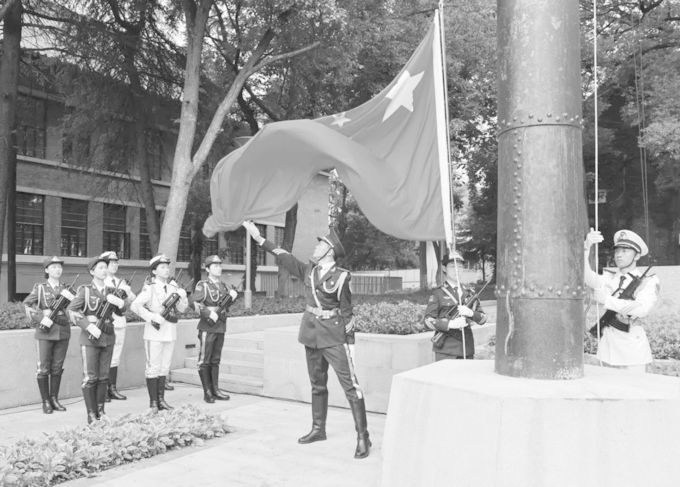 终于,1935年8月,一座高耸入云的旗杆在学校大礼堂南侧拔地而起。此旗杆入地5米,地上部分由28节钢管套接而成,高43.67米,成为当时凯发k8官网最高的旗杆,其质量与外观都胜日本旗杆一筹。它以“镇其邪、挫其锐、克其霸”的雄姿,让中国人的旗帜傲然飞扬。