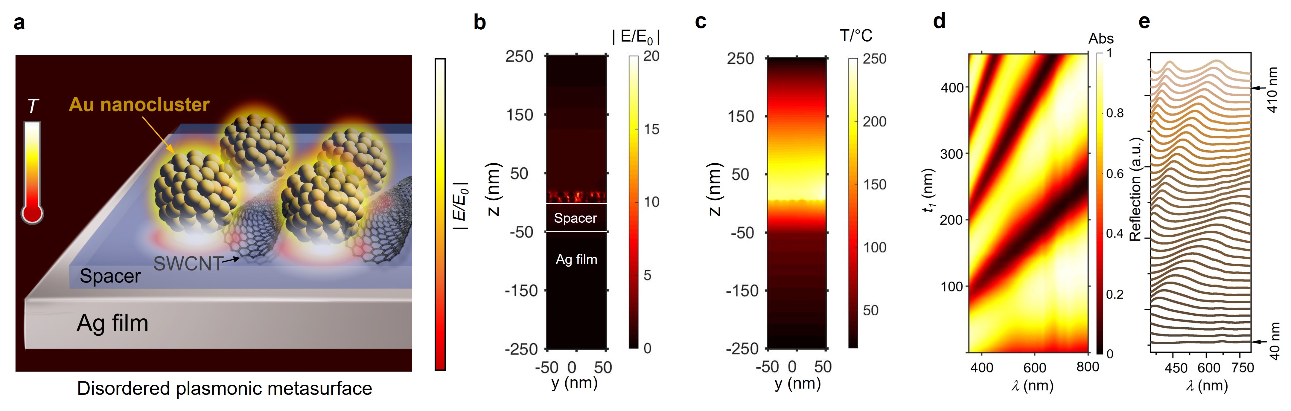 图2. (a)团簇组装等离激元无序超表面;FDTD和FEM模拟的结构内部(b)电场分布:(c)温度场分布;无序超表面光吸收(d)及反射(e)随光学腔厚度(spacer)的变化。
