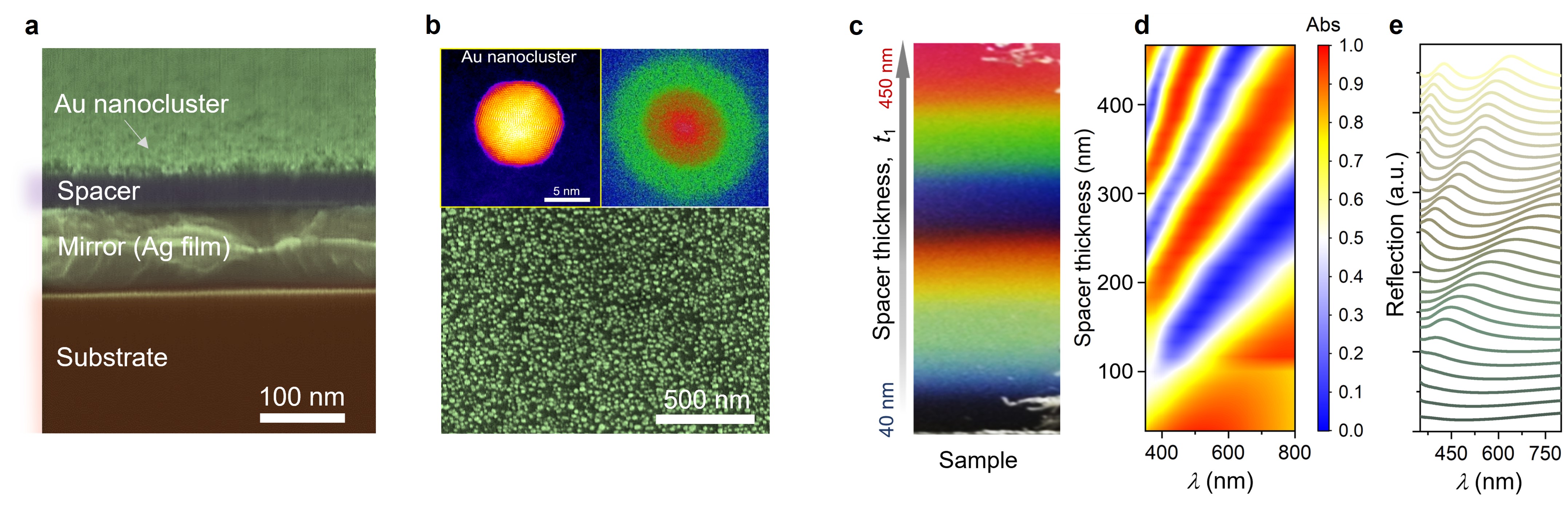 图3. 团簇组装无序超表面的SEM截面图((a))及表面形貌(b);当超表面中光学腔参数(spacer 厚度)连续变化时,超表面实际样品照片;对应的吸收(d)及反射(e)光谱。