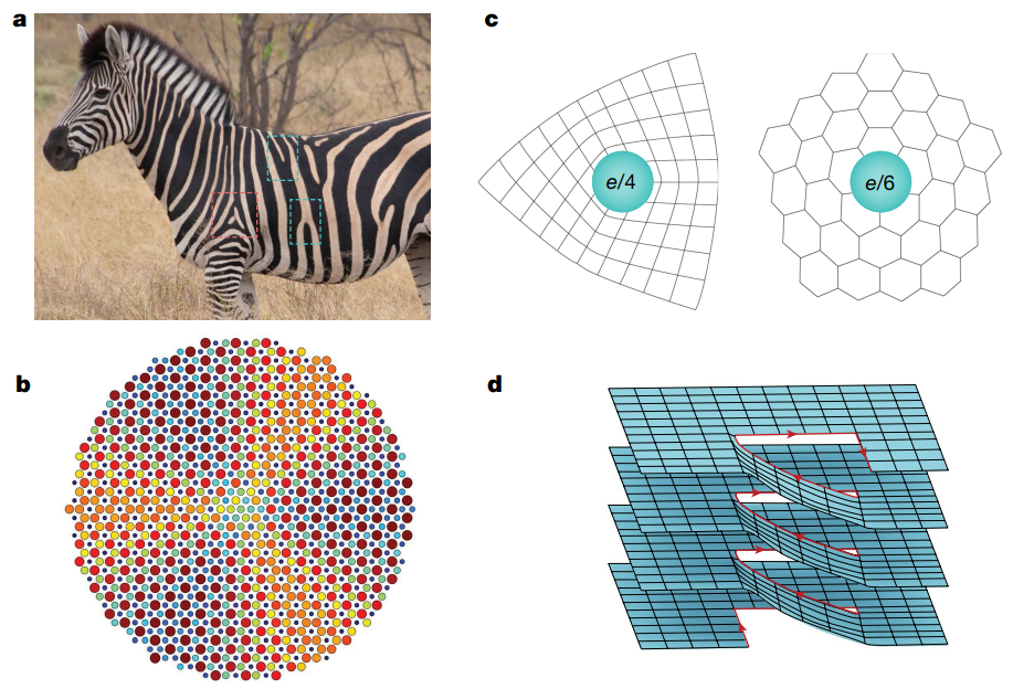 图5. 拓扑缺陷。(a)斑马条纹中的拓扑旋错(红框)和位错(蓝框)。(b)在声学系统中基于Kekulé结构涡旋构造的声学Jackiw-Rossi型拓扑缺陷。(c)基于四方和六角晶格形成的拓扑旋错分别携带以e/4和e/6为单位量的分数电荷。(d)通过切割-粘合二维堆叠拓扑绝缘体形成的三维螺旋位错。