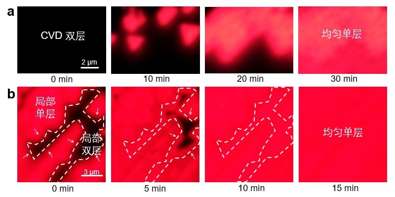 最后,团队还展示了该方法在化学气相沉积样品上的可行性。如图3,在适当的光照条件下,不仅可将双层WS2(在光致发光成像中显示为黑色区域)转化为单层(红色区域),而且还可将不均匀的单/双混合层WS2转化为纯净的单层,实现可控的冗余层移除。该技术为二维层状范德华半导体晶圆的厚度剪裁提供了一种简便的方案,用于解决二维电子学中面临的均匀性管理挑战,有望促进电子级范德华半导体晶圆的开发。