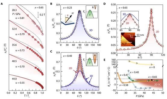 图3.利用高压/化学计量比动态调控AsxP1?x超导维度属性。(A)不同压力下面内上临界磁场与温度的依赖关系。红色拟合曲线: