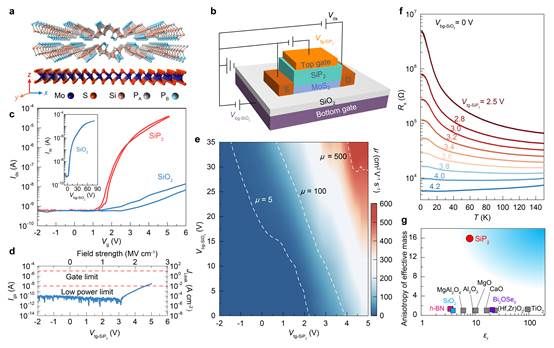 图1. 基于C2旋转对称性的SiP2介电材料的高性能MoS2双栅晶体管。(a)MoS2/SiP2异质结构的示意图。(b)基于SiP2介电材料的MoS2双栅器件示意图。(c)基于5-nm-MoS2的双栅晶体管在2 K时通过扫描顶栅电压(红色曲线)和底栅电压(蓝色曲线)时的转移特性曲线。(d)2 K下5-nm-MoS2/SiP2器件的漏电流与外加栅压的关系。(e)5-nm-MoS2/SiP2器件中双栅调控的场效应迁移率。(f)不同SiP2栅压条件下单层MoS2的电阻温度关系。(g)不同电介质的有效质量各向异性比的比较。各向异性比定义为电子有效质量沿相应晶格y和x方向的比值。