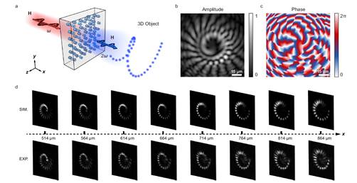 图2 三维全息图像的非线性重构。a 二次谐波复原三维图像示意图。b-c 非线性全息图振幅和相位分布。d 二次谐波图案沿传播方向分布的模拟和实验结果。