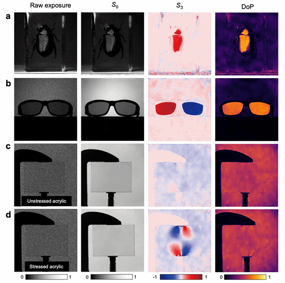 图2. 全Stokes偏振成像。使用所提出的超构表面偏振相机拍摄的室内(a到c)和室外(d)照片。在每种场景下,都展示了原始曝光图像、S0、幅角和偏振度。