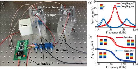 图2基于反馈电路的等效声耦合。(a)实验设计的等效声耦合由探测A(B)腔声信号并输入给B(A)腔的双向反馈电路实现。(b)耦合打开(蓝色)或断开(红色)时A腔的激发谱线。(c)反馈电路同相(红色)或反相(蓝色)连接时A和B两腔的声波相位差。
