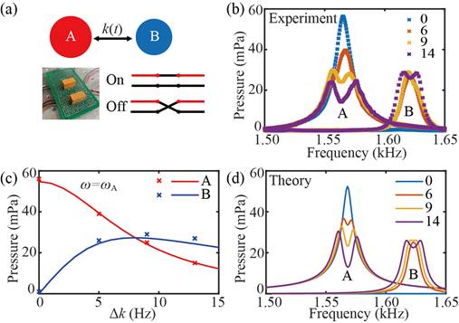 图3 基于动态耦合的频率转换特性。(a)通过运用电控开关,在失谐腔之间构造时变耦合κ(t)。(b-d)从A腔激发,不同耦合强度下A和B腔的声压谱线。(c)显示动态耦合幅值Δk/2π ≈ 9Hz时,从A传播到B腔的声压幅值达到最大值。