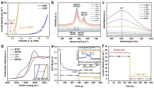 图3. 非氧化还原三价镍作为尿素电氧催化中心的证据。(a)计时电流-电位数据拟合得到的线性扫描伏安曲线。(b-d)Ni(OH)2电极尿素电氧化的电位依赖的b)原位拉曼光谱,c)原位紫外-可见吸收光谱,d)原位镍K边X射线吸收近边结构谱。(e)Ni(OH)2电极开路电压在电解液注入尿素前后的多段衰减。(f)当阳极电位在1.45 V和1.31 V之间阶跃时电流密度变化。