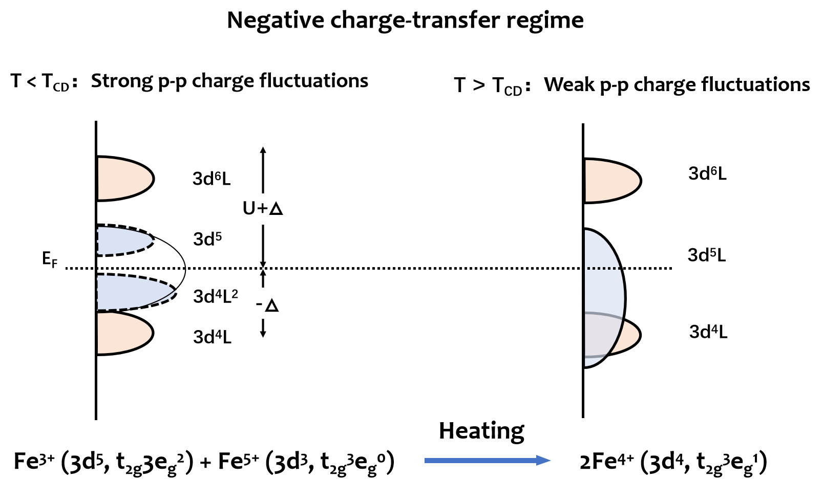 强关联电子体系的电子态取决于电子库伦作用力(U)和电子转移能(?),比如,Fe基钙钛矿型氧化物的(FeO6)8-八面体具有负电荷转移能,此时由于Fe3d - O2p轨道强相互作用产生配体空穴而使得Fe4+(3d4,t2g3eg1)电子态稳定。然而,在低温下,由于强的p-p轨道电子波动使得配体空穴不稳定而容易诱发Fe4+(3d4,t2g3eg1)电荷歧化2Fe4+(3d4,t2g3eg1)→ Fe3+(3d5,t2g3eg2)+ Fe5+(3d3,t2g3eg0),产生3d轨道被单电子完全占据的Fe3+(3d5,t2g3eg2)(图1)。这意味着,加热至电荷歧化温度(TCD)以上抑制电荷歧化是稳定Fe4+电子态的有效途径。当电荷歧化被热抑制时,体相材料中Fe4+(t2g3eg1)的未占据eg轨道可以作为电子传输通道而无需克服电子翻转或配对能。