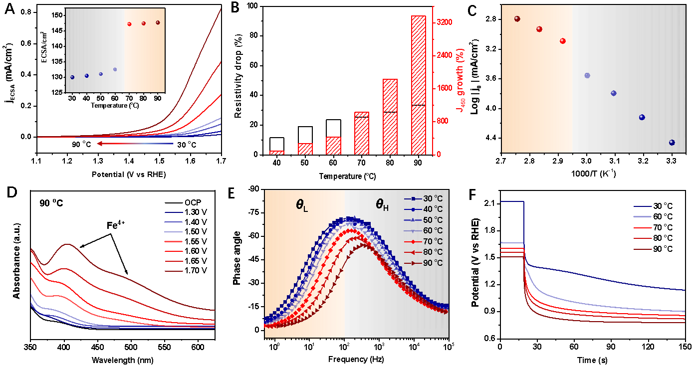 4. 热抑制电荷歧化加速水氧化。(A在扫描速率为10 mV/s80% iR补偿条件下,ECSAs归一化的温度依赖LSV曲线。(B)随温度变化的电阻率下降率(红色柱)和在450 mV过电位下的电流密度(J450)的增长率(红色柱)。(C)温度倒数与交换电流密度对数的Arrhenius。斜率表示OER活化能。(D)在90 oC1M KOH中不同电位下Sr3Fe2O7@SrFeOOH的原位UV-Vis吸收光谱。(E)温度相关的Bode图。θLθH表示低频相位角(< 100 Hz)和高频相位角(> 100 Hz)。(F3060708090 oC时,10 mA cm-2条件下进行OER后监测的Vocp衰减。