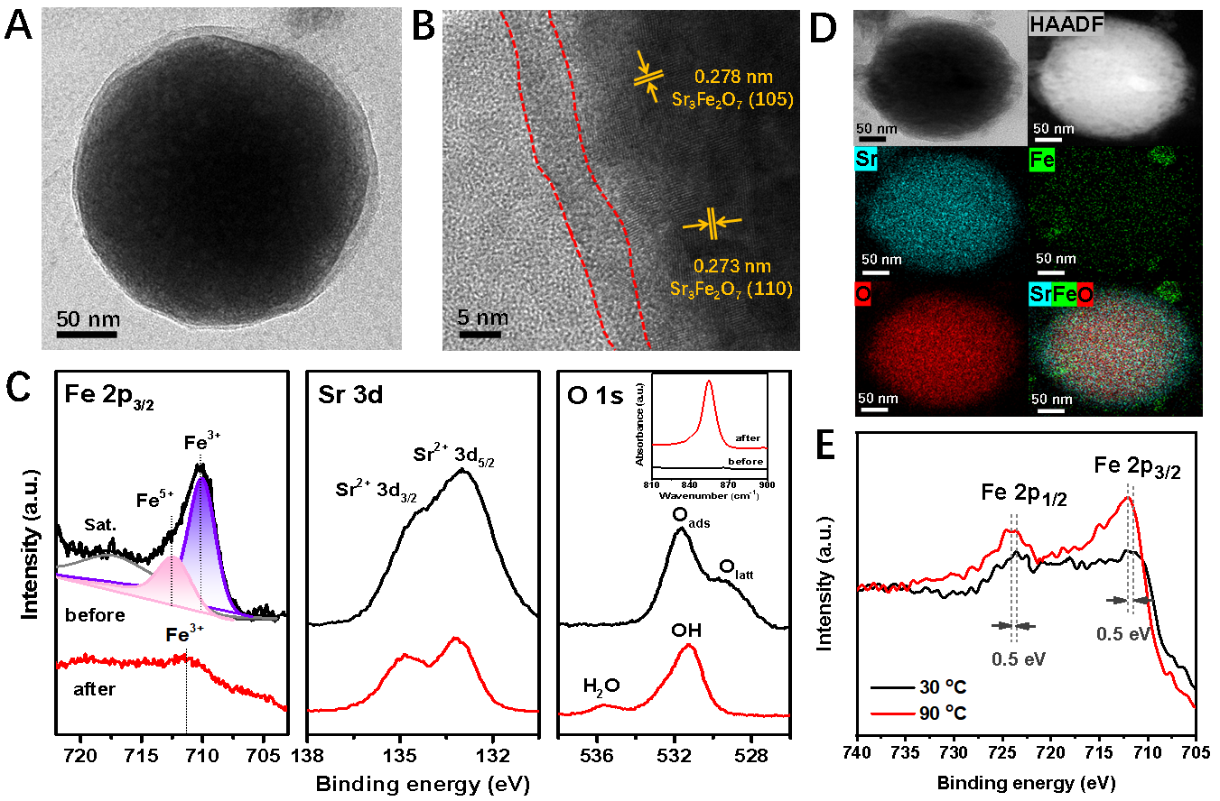 3.AB)在90 oC1.0 M KOH中以1.6 V vs RHE的电压下活化后的Sr3Fe2O7HRTEM图(A)及其放大的晶格图(B)。虚线部分为非晶SrFeOOH层。(C)活化前后Sr3Fe2O7表面的Fe 2pSr 3dO 1s XPS光谱。插图为Sr3Fe2O7活化前后的FTIR光谱。(D)核-壳结构Sr3Fe2O7@SrFeOOHHAADF-STEM图和相应的EDS元素分布。包括SrFeO的分布以及它们在壳层中的混合分布。(ESr3Fe2O7@SrFeOOH3090 oC下的原位Fe 2p XPS谱。