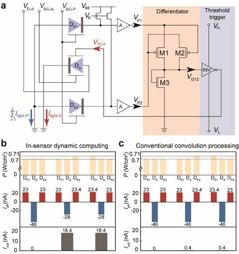 图3:基于多端口石墨烯/锗异质结光电器件的一维关联计算。(a) 计算单元的电路结构示意图;(b-c) 传统卷积处理与感内动态计算在三种光强分布下的光电流输出结果。