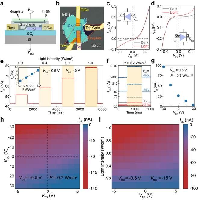 图2:多端口石墨烯/锗异质结器件的光电响应特性。(a) 器件结构示意图;(b) 器件光学照片;(c-d) 器件在两种不同极性偏置下的I-V特性;(e) 器件光电流随光强的变化;(f-g) 器件光电流随背栅电压的变化;(h) 器件光电流在顶底双栅调控下的变化;(i) 器件光电流在给定背栅下,随光强与顶栅偏压的变化。