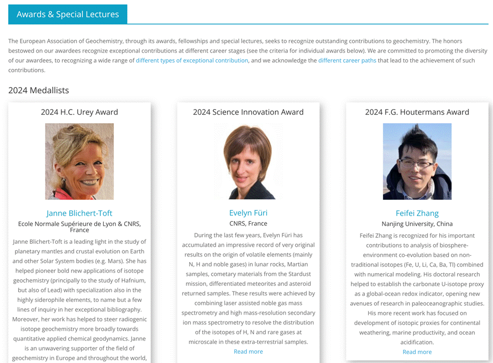 欧洲地球化学学会官网对2024年EAG的三个奖项获奖人的介绍