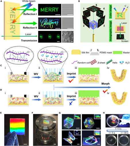 本工作首先利用丝蛋白在水蒸气刺激下发生的分子链重排特性,发展了可扩展、空间可控和多策略的微/纳米压印技术,在2D丝蛋白薄膜上实现了无串扰、可独立操控的多个光学信息通道的集成(图1A, C, D)。进一步,借助水蒸气诱导的丝蛋白可重新塑形特性,构建了复杂、多模态的3D立体结构,从而实现了光学信息复用维度的提升(图1B-D, G)。更重要的是,凭借丝蛋白在水蒸气作用下发生的可逆分子重排,该光学平台可实现光学信息的重写和3D结构的重编程。由于基于蚕丝蛋白薄膜的微/纳米压印技术操作环境温和、步骤简单,此多功能平台可大面积制备(图1E)。另外,蚕丝蛋白良好的黏附性赋予了此光学平台在不同质地和形貌的基底上的稳定贴附(图1F)。最后,蚕丝蛋白固有的环境友好性、生物相容性和生物可降解性使多功能光学平台不会对环境造成污染,并可与人体建立良好的界面(图1H)。