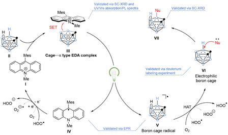 基于以上实验结果,作者提出了如下反应机理:即在绿光诱导下,巢式碳硼烷底物与吖啶催化剂经过非共价cage···π相互作用发生单电子转移,生成巢式碳硼烷自由基。随后,经过B–H–B氢原子转移(HAT)过程,生成高反应活性的中性硼笼中间体,其与亲核试剂反应生成B(9)位点取代产物(图3)。
