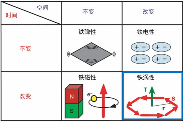 图 1. 铁性材料根据时间和空间反演对称性操作可分为的四类。铁弹性:既不打破时间也不打破空间反演对称性。铁电性:打破空间反演对称性而不打破时间反演对称性。铁磁性:打破时间反演对称性而不打破空间反演对称性。铁涡性:自旋矢量S的涡旋导致了一个铁涡矩T,同时打破了时间反演和空间反演对称性。该图取自Nature 449, 702 (2007)。