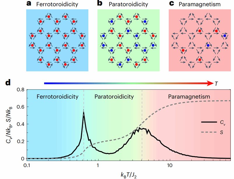 图3. 理论上的三种相和相变。(a-c)三种物相下自旋和铁涡矩的分布构型,分别对应铁涡相(a)、顺涡相(b)、顺磁相(c);(d)蒙特卡罗模拟下系统随温度变化的比热和熵(相变过程)。