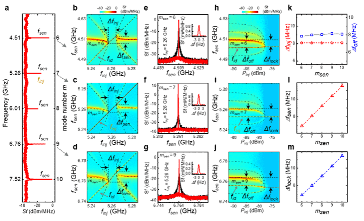 图 3. 频率梳的相干注入锁定效应。(a) 频率梳频谱,其中注入信号频率选在第7阶模式频率附近。(b-d) 在固定功率 (Pinj = -82 dBm) 下,通过在 f7 周围扫描注入频率 finj信号,并在不同探测模式 msen=6 (b), 7 (c) 和 9 (d) 下获得的光谱图。辐射信号在 Δfinj 和 Δfsen 范围内被锁定。(e-g) 自由运行(黑色)和注入锁定(红色)状态下的光谱比较。插图显示了线宽,所有锁定模式的线宽都 ≤ 1 Hz。(h-j) 在偏离共振频率(finj=f7-Δfoff; f7=5.26 GHz, Δfoff=8 MHz)下,通过改变注入功率 (Pinj) 获得的光谱图。锁定频率与自由运行辐射频率的偏移由 Δflock 表示。 (b-d, h-j) 中的长虚线采用本研究提出的扩展 Adler 方程 (2) 的拟合。(k-m) Δfinj 和 Δfoff (k)、Δfsen (l)以及 Δflock (m) 随模式数 m 的变化图。