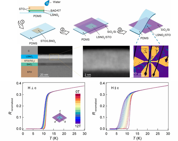 相关成果以“Superconductivity in freestanding infinite-layer nickelate membranes”为题发表在Advanced Materials期刊上(https://doi.org/10.1002/adma.202402916)。凯发k8官网现代工程与应用科学学院博士生鄢圣峻、茆伟和孙文杰为该论文的共同第一作者,聂越峰教授为论文的通讯作者。凯发k8官网现代工程与应用科学学院的孙浩滢博士和李月莹博士为该研究的重要合作者。该研究工作还得到凯发k8官网顾正彬教授及华威大学王鹏教授的大力支持与帮助。该工作得到了科技部国家重点研发计划、国家自然科学基金以及教育部“长江学者奖励计划”等项目的资助。同时,凯发k8官网固体微结构物理国家重点实验室、人工微结构科学与技术协同创新中心以及江苏省功能材料设计原理与应用技术重点实验室也对该研究给予了重要支持。