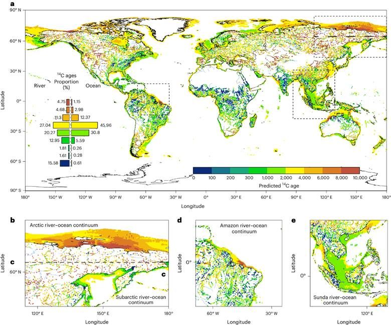 图- 3 全球河流POC和海洋沉积OC 14C年龄的全球分布(a),以及部分典型子区域(b-e):北极(b)和亚北极(c)河流-近海连续体,亚马逊流域及邻近河口区(d)和东南亚地区河流-近海连续体(e)。