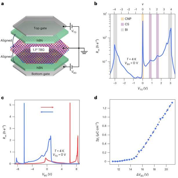 图1:DA-MATBG器件的电学表征。(a) 双栅DA-MATBG器件的结构示意图。1.1°转角双层石墨烯的晶向与两侧相邻的h-BN晶体的晶向对齐。顶栅电压VTG和底栅电压VBG分别施加在顶部和底部的石墨栅极上。(b) 通过四探针法测量纵向电阻Rxx随VTG的变化关系,可以观察到对应于电中性点(charge neutrality point, CNP)、能带绝缘体(band insulators, BI)和关联态(correlated states, CS)的特征,在图中分别用淡黄色、灰色和淡紫色背景来标识。(c) Rxx随VBG的变化关系表现出明显的铁电回滞现象。红色和蓝色实线分别表示VBG前向和反向变化的结果。(d) 剩余极化强度2pr与VBG扫描范围ΔVBG = Vmax BG– Vmin BG的依赖关系,这里Vmax BG和Vmin BG分别表示VBG的最大值和最小值。