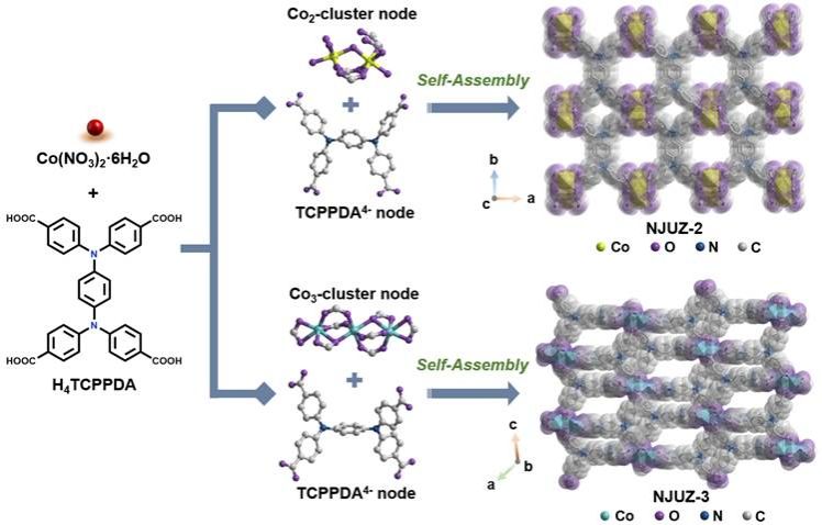 凯发k8官网化学化工学院金钟、马晶、苏剑等人密切合作,在这项研究中报告了两种基于钴团簇的多核配位聚合物{[Co2(TCPPDA)(H2O)5]·(H2O)9(DMF)}和{Co1.5(TCPPDA)[(CH3)2NH2]·(H2O)6(DMF)2}(命名为NJUZ-2和NJUZ-3)的设计和合成,它们具有不同的配位环境,明确的孔隙率、高密度催化位点、有效的传质通道和纳米限域的化学环境。得益于其独特的多核金属有机配位框架结构,NJUZ-2和NJUZ-3对电催化硝酸根还原(NITRR)表现出优异的催化活性。进一步的实验分析结合理论计算表明NITRR活性的显著增强归因于NO3-在催化剂表面的优先吸附和*NO3和*NO2中间体加氢所需的能量输入的降低。