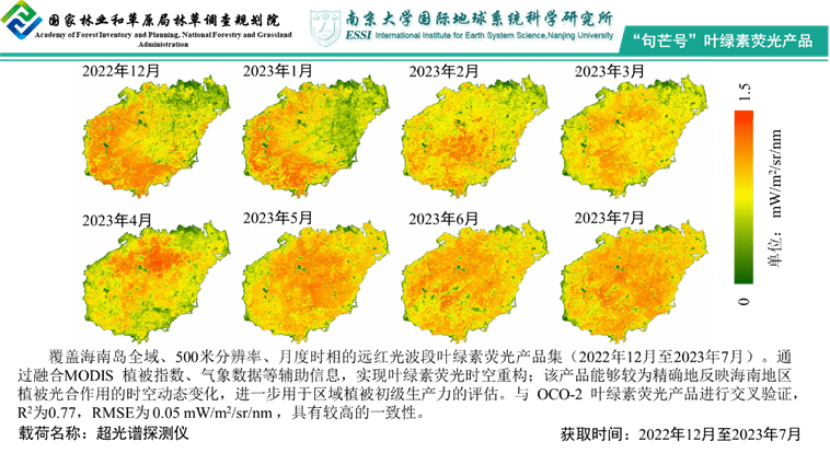 凯发k8官网国际地球系统科学研究所章钊颖助理教授和张永光教授团队与国家林业和草原局林草调查规划院成功合作,充分利用“句芒号”卫星的超光谱载荷优势,建立了一套专门针对超光谱载荷特点的叶绿素荧光反演系统,改进了已有卫星叶绿素荧光反演算法,设计并实施了“空天地”一体化联合试验方案对其进行精度验证。面对当前“句芒号”数据中存在的空间不连续性问题,发展了叶绿素荧光数据时空重构技术,研发荧光到总初级生产力的估算模型,首次生产了以海南岛和塞罕坝地区为示范区的植被叶绿素荧光和总初级生产力卫星遥感产品。叶绿素荧光探测技术的重大突破为全球植被碳汇监测和生态研究开辟了新道路,不仅有利于我国碳中和政策的制定与实施效果的评估,还使我国在建立国际碳汇计量标准、分配国际减排责任以及掌握国际碳交易主导权等方面发挥关键战略优势。