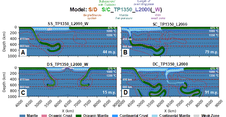 xx)(第二列)的演化; (I) 相对次大洋地幔的次大陆地幔温度上升(ΔTc)。模型命名参考图 2 。