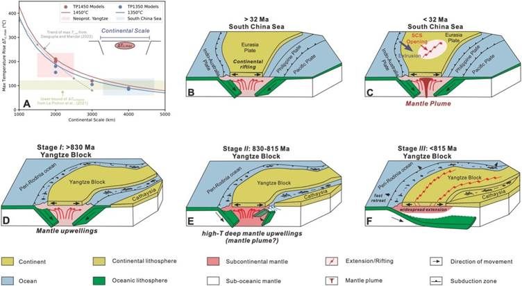 图4. (A)双向俯冲数值模拟及理论模型的比较与(B-C)南海和(D-F)新元古代扬子陆块演化过程。(A)中大陆尺度和ΔTc,max表示大陆两侧内倾俯冲带之间的距离和次大陆地幔的最大升温。(A)中的红线和蓝线分别代表1450°C和1350°C时地幔温度的理论模型结果,阴影区域代表新元古代扬子地块和新生代南海根据其大陆尺度对次大陆最高升温的估计。(B–F) 的图例显示在底部。