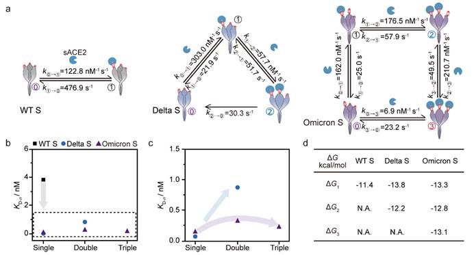 凯发k8官网龙亿涛/应佚伦团队基于配体-受体结合诱导的体积增大效应,构建了一种配体-受体锚定的限域纳米孔道单分子电化学分析方法,模拟配体在生物界面上的空间取向,从而保持其结构的灵活性和最优的结合取向。团队利用纳米孔道尖端电荷放大效应,将配体-受体的解离和结合动态过程转化为可测量的高时间分辨离子流电信号(图1),实时追踪了SARS-CoV-2奥密克戎变体(Omicron S)、原始毒株(WT S)和德尔塔毒株(Delta S)刺突蛋白与可溶性血管紧张素转换酶2(sACE2)受体间多价相互作用,解析了刺突蛋白的每一个亚基与sACE2的结合和解离速率,从而在单亚基水平揭示了SARS-CoV-2变体刺突蛋白与受体结合路径和动力学差异(图2)。研究发现,Omicron S的三个亚基均具有对sACE2受体同等且极大的亲和能力,倾向于同时与三个受体结合,而WT S和Delta S则分别倾向于仅与一个或两个受体结合,且在与第一个sACE2结合后,其第二个亚基的结合能力显著下降(图3)。