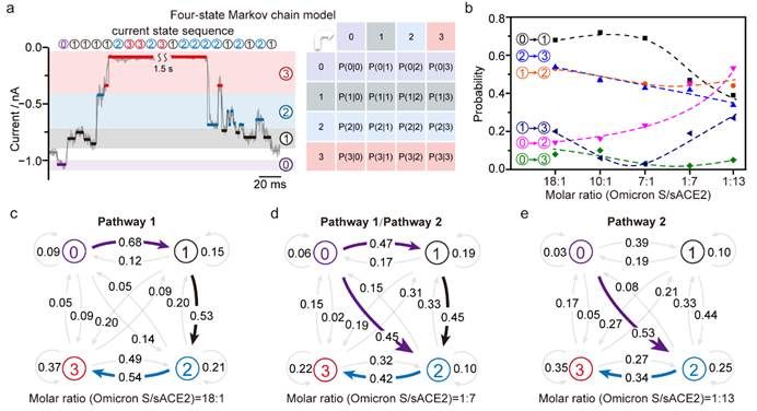 图2. 单分子水平解析Omicron S随sACE2受体浓度依赖的结合路径.