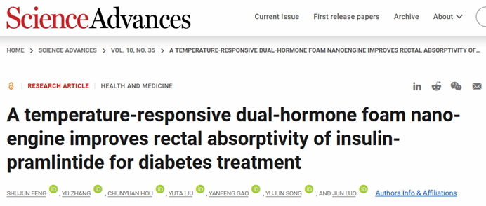 相关研究以“A temperature-responsive dual-hormone foam nanoengine improves rectal absorptivity of insulin-pramlintide for diabetes treatment”为题于Science子刊Science Advances, DOI: 10.1126/sciadv.adn8695.凯发k8官网现代工程与应用科学学院2024届博士毕业生冯淑君和凯发k8官网理工大学张宇博士为本文的第一作者。凯发k8官网理工大学罗军教授、凯发k8官网宋玉君教授、凯发k8官网/皖南医学院高彦峰博士和凯发k8官网理工大学张宇博士为本文的通讯作者。本研究受到国家自然科学基金和江苏省自然科学基金的资助。