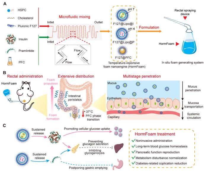 研究团队设计了具有鱼骨结构的微流控芯片,用于Pluronic F127功能化胰岛素/普兰林肽脂质体和全氟化碳纳米液滴的连续化制备。其中,脂质体腔室给胰岛素和普兰林肽提供了独立的局部微环境,解决了复配不相容的局限,并且实现药物的缓慢释放延长有效时间。值得注意的是,全氟化碳纳米液滴在生理温度下由液态变为气态,这一汽化过程为泡沫的形成提供推进力,可以将药物带入直肠深处。同时,泡沫液膜的柔韧性与灵活的变形性促使它们能够准确匹配直肠腔道的边缘或褶皱,扩大药物的分布面积。此外,由于泡沫密度较低,可以减缓异物感,提高患者的依从性。
