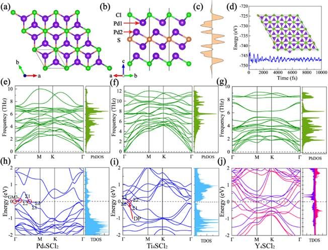 图1. M4SCl2的晶体结构、声子谱和能带结构;Pd4SCl2的电子密度分布和AIMD模拟结果。