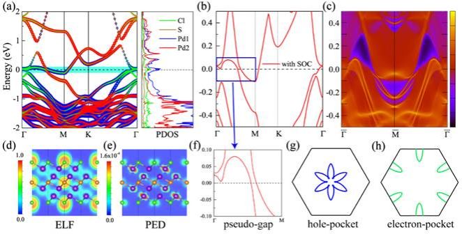 图2. Pd4SCl2化合物的电子结构,包括投影能带、局域化函数和一维费米线;及其拓扑边缘态