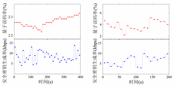 利用上述核心系统与技术,研究人员最终在相距200米的无人机与地面站之间建立了一条低损耗、高保真的光量子链路(链路损耗约9 dB),并在夜晚和照度低于3000 lx的白天成功实现了量子密钥分发实验演示,见图3。夜晚实验采集时间400秒,平均安全密钥生成率 >8 kbps,平均误码率约2.28%。白天实验采集时间200秒,平均安全密钥生成率 >6 kbps,平均误码率约3.86%,见图4。实验结果证实了利用无人机平台实现实用化光量子信息任务的可行性与可靠性。